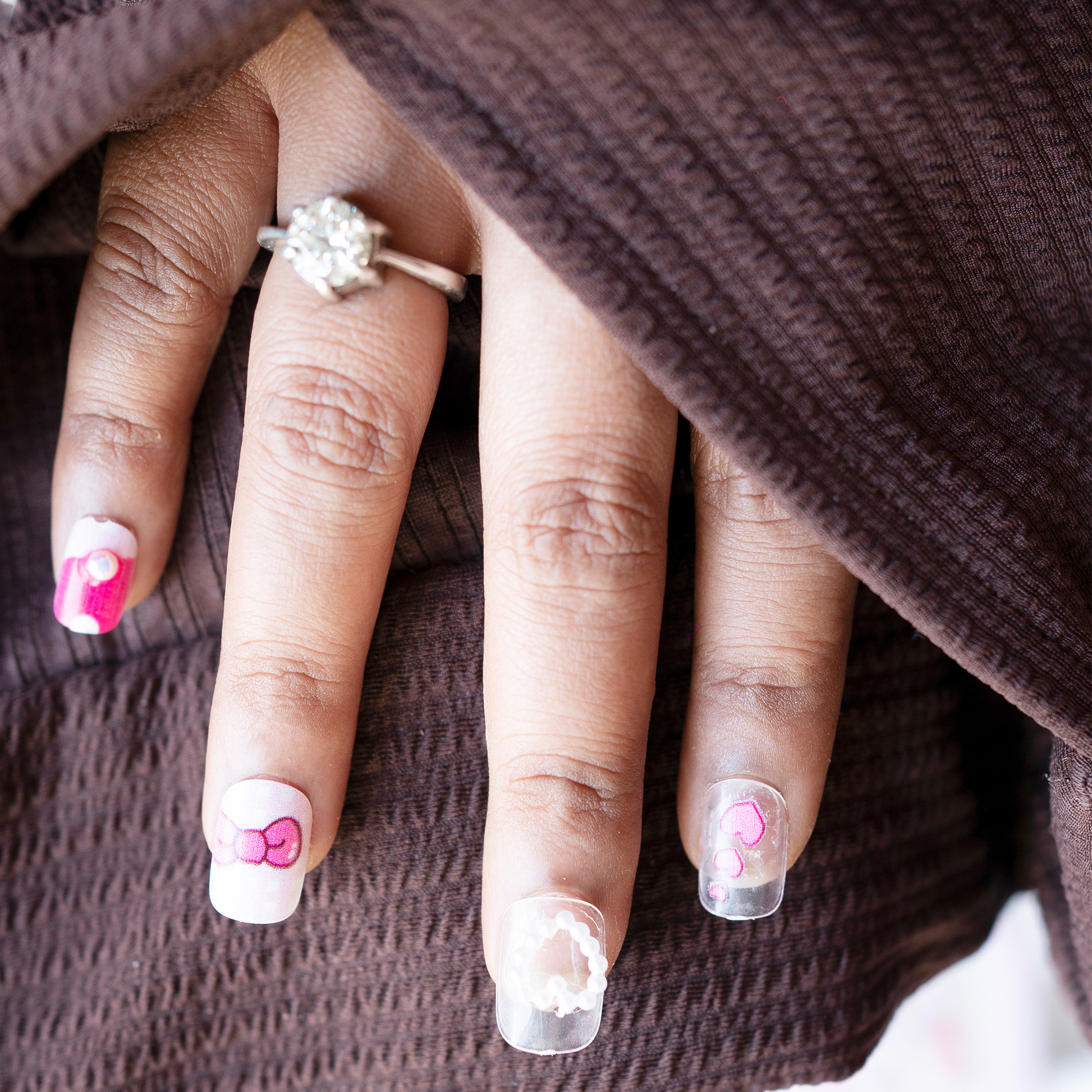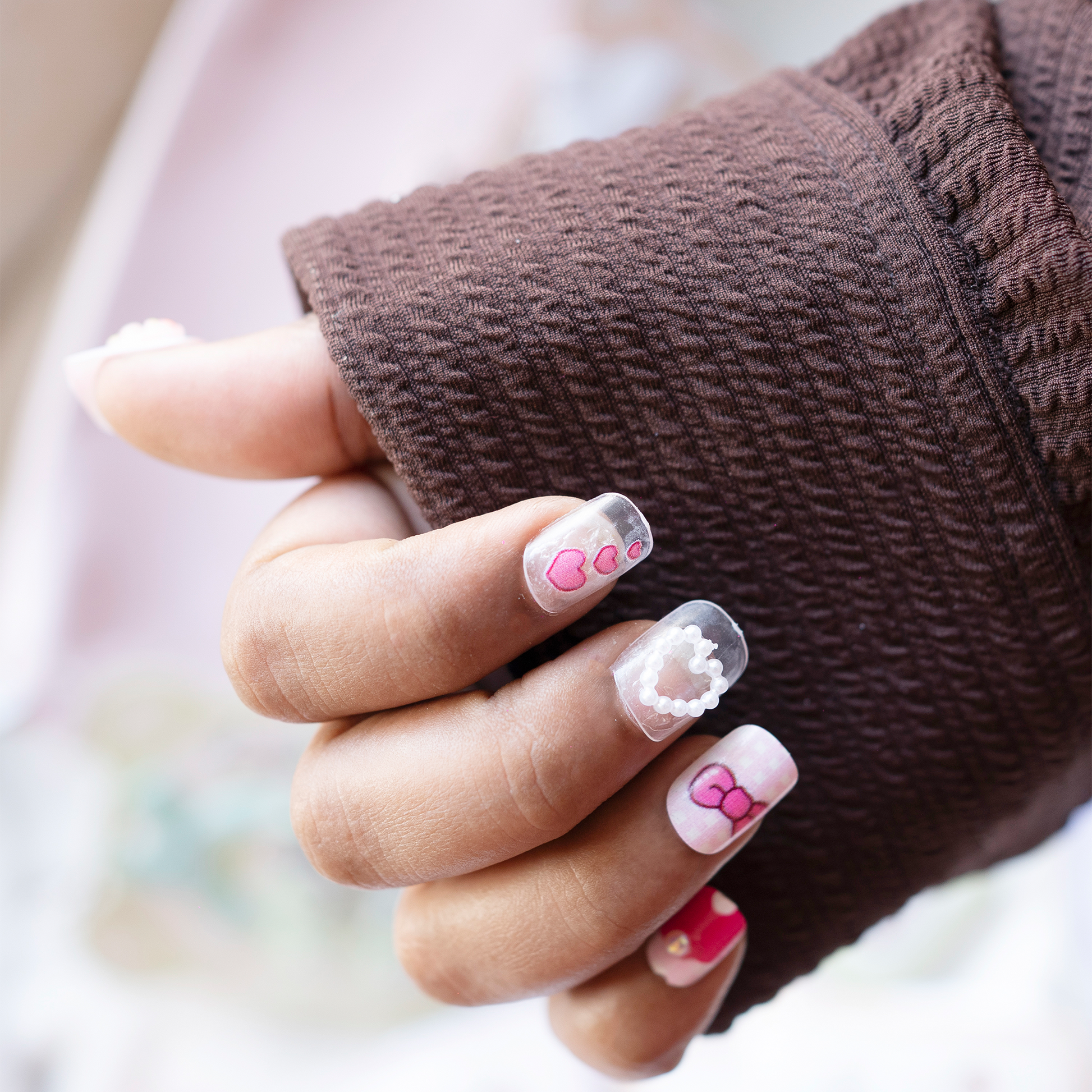 A charming pastel nail set filled with hearts, bows, and adorable character designs.The soft pink shades give it a sweet, girly touch that stands out beautifully.Perfect for anyone who loves cute, playful, and kawaii-inspired nail art.