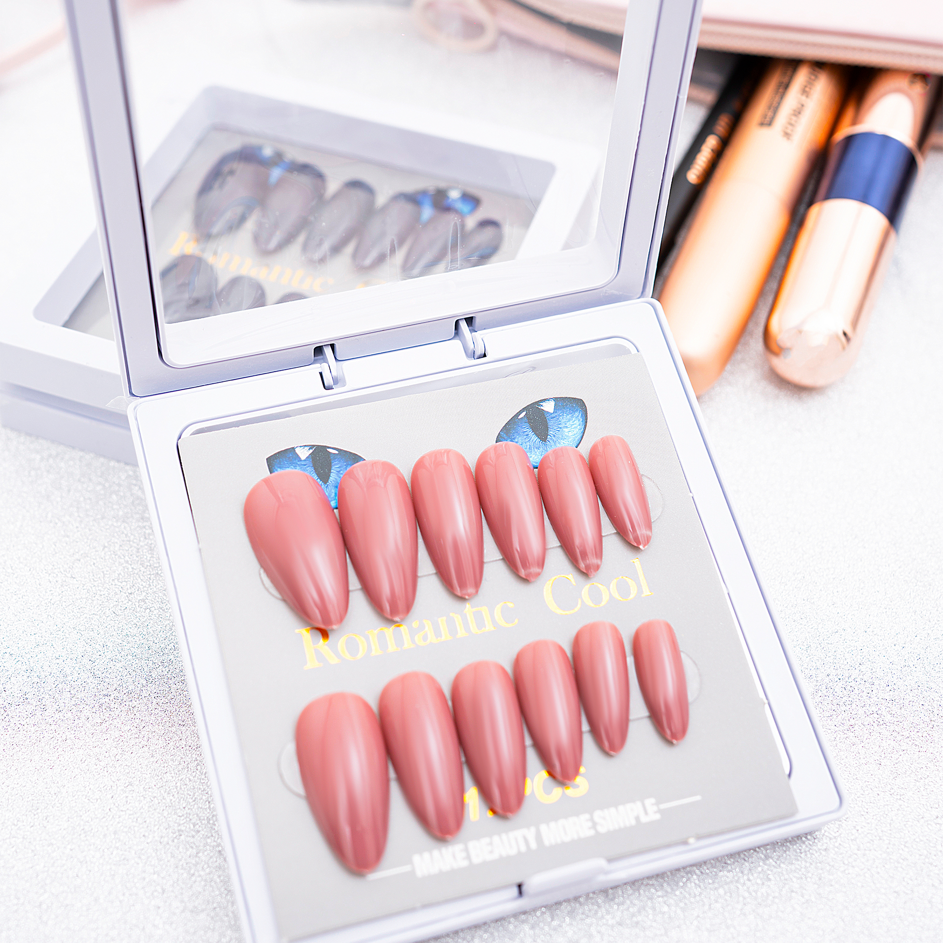These gorgeous, almond-shaped press-on nails feature a soft, dusty rose or blush pink shade. Their high-shine finish provides a chic, sophisticated, and effortlessly romantic look perfect for any occasion.