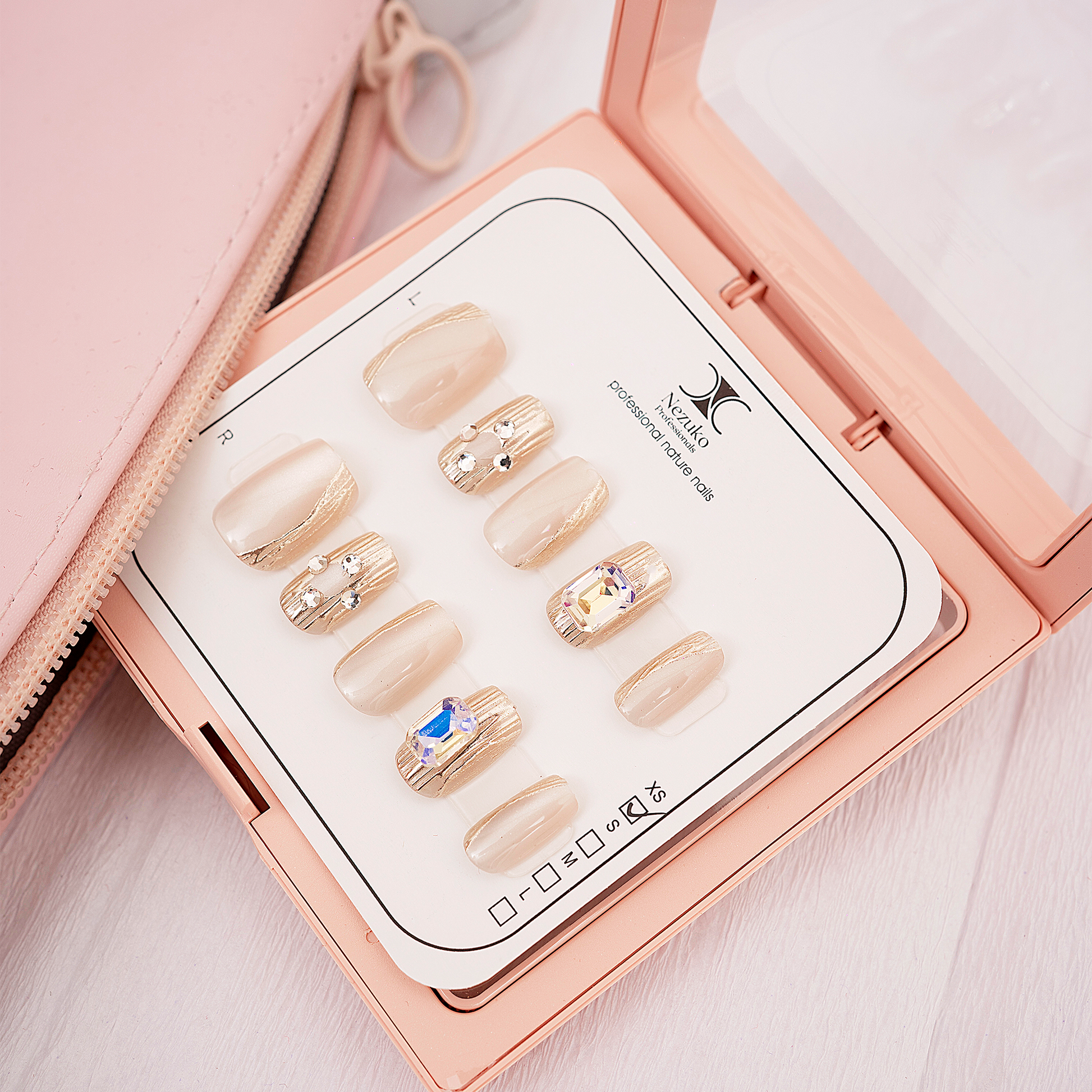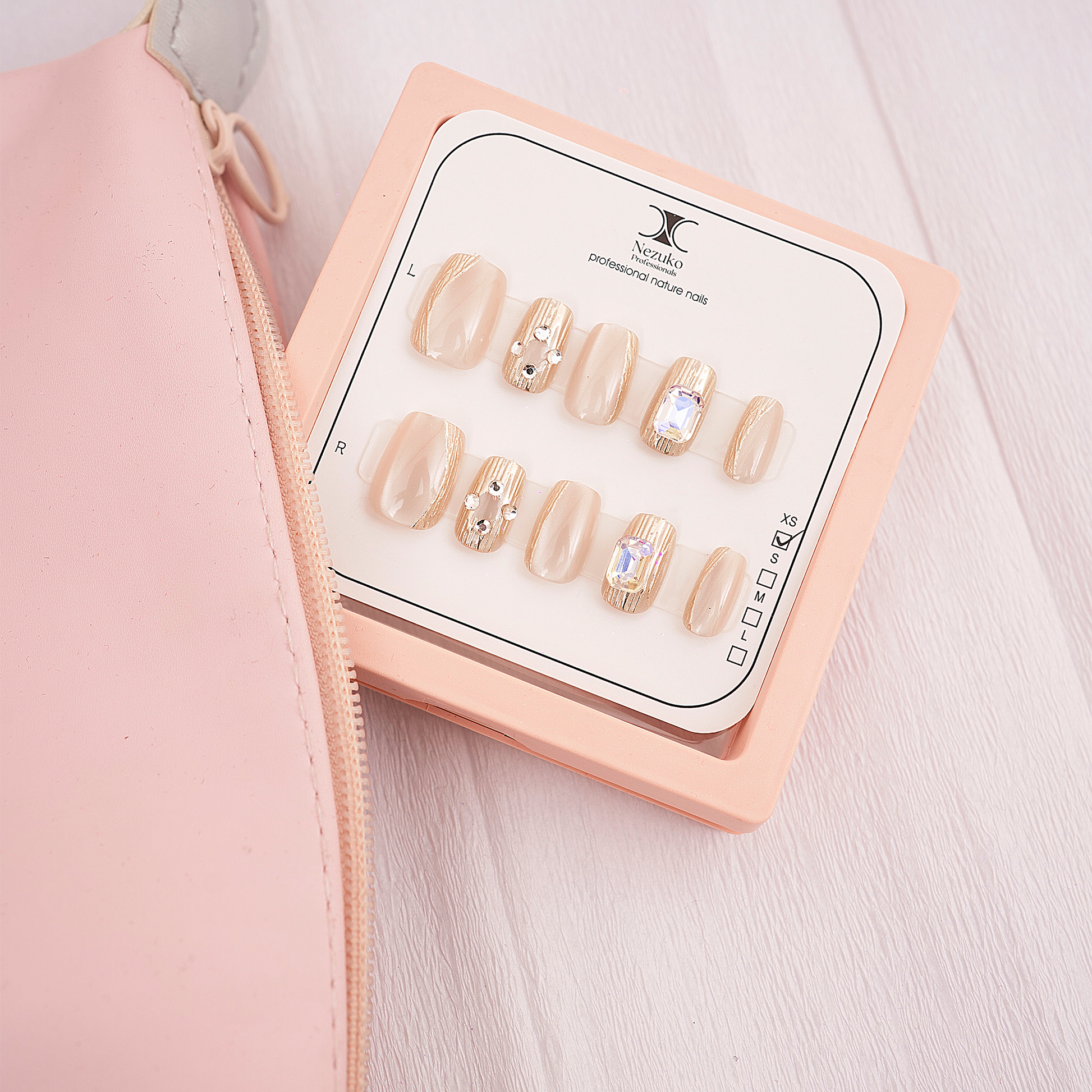 Soft champagne hues paired with delicate shimmer give these nails a smooth, luxurious finish. Crystal accents add a gentle sparkle, creating a timeless and elegant look perfect for any occasion.
