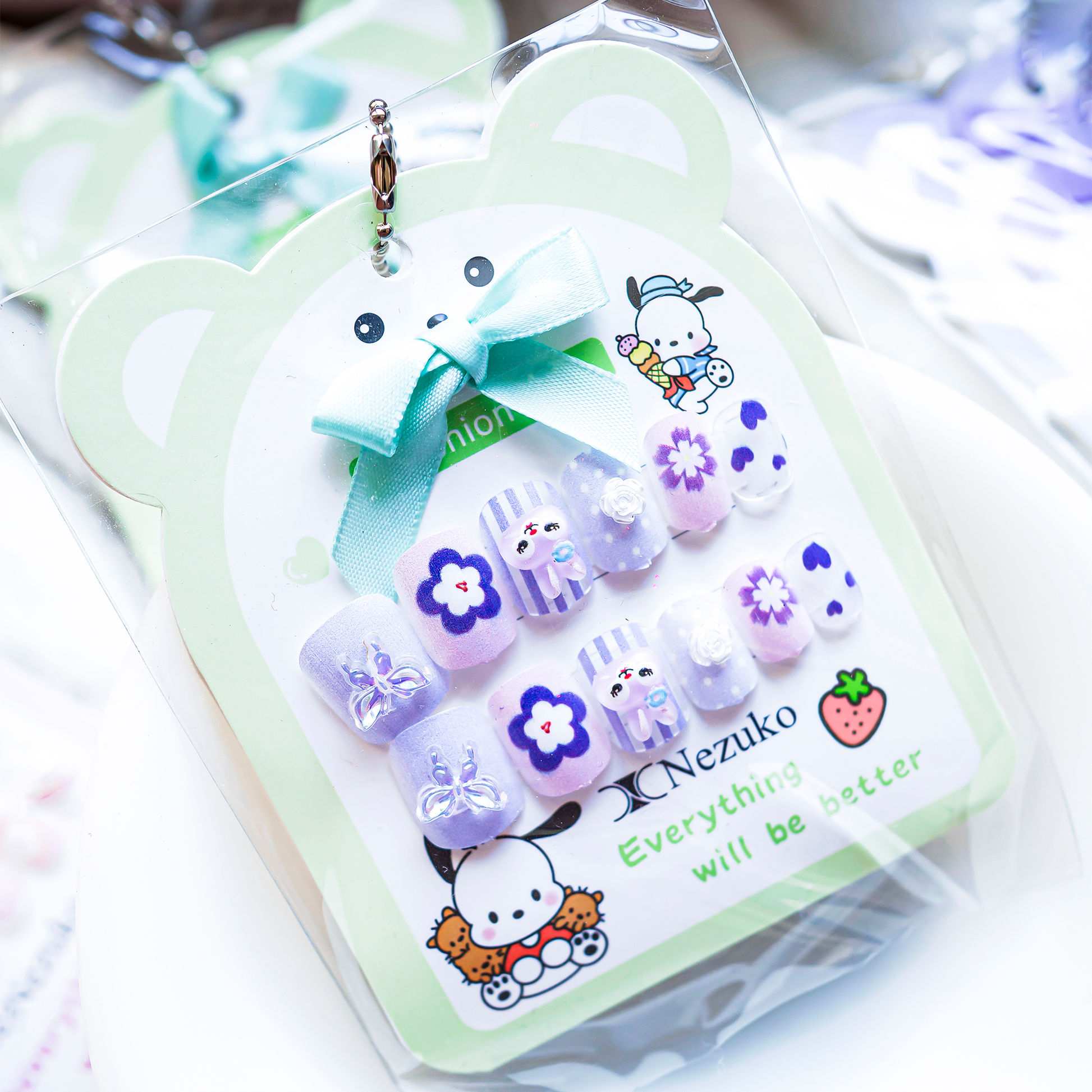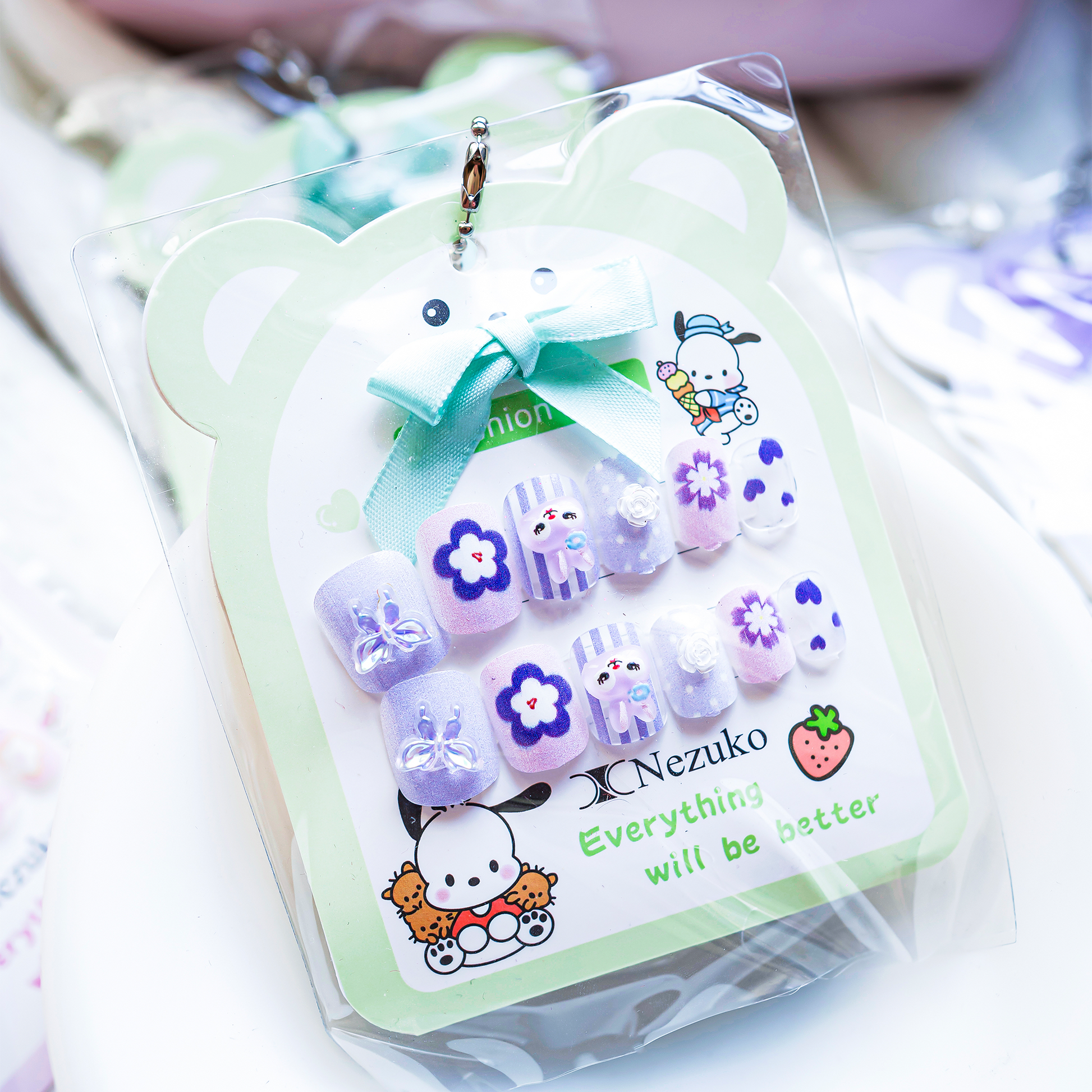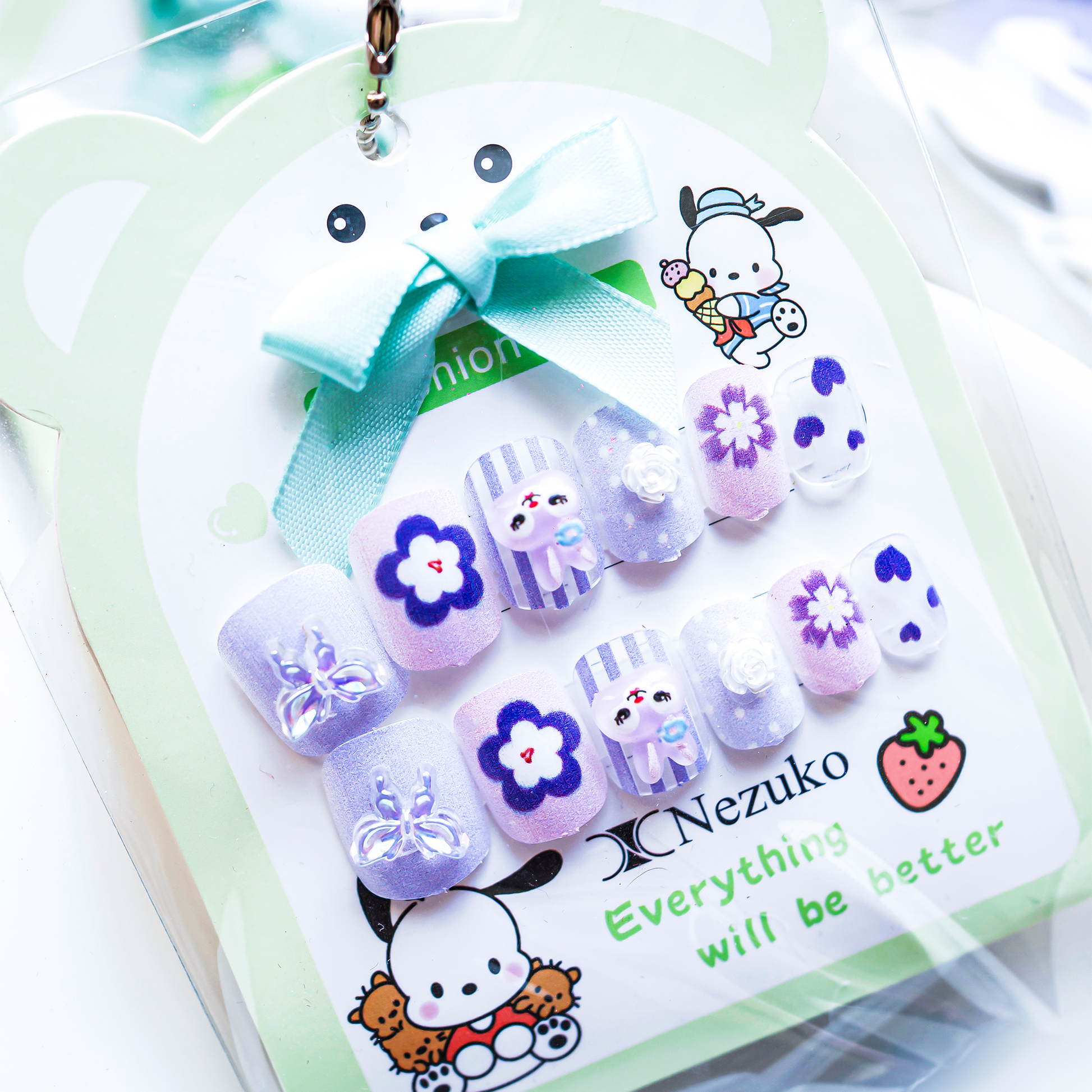 Soft purple and pink press-on nails decorated with 3D butterflies, flowers, and a cute bunny character for a dreamy look. A charming pastel set that adds a playful, storybook touch to everyday wear or special events.