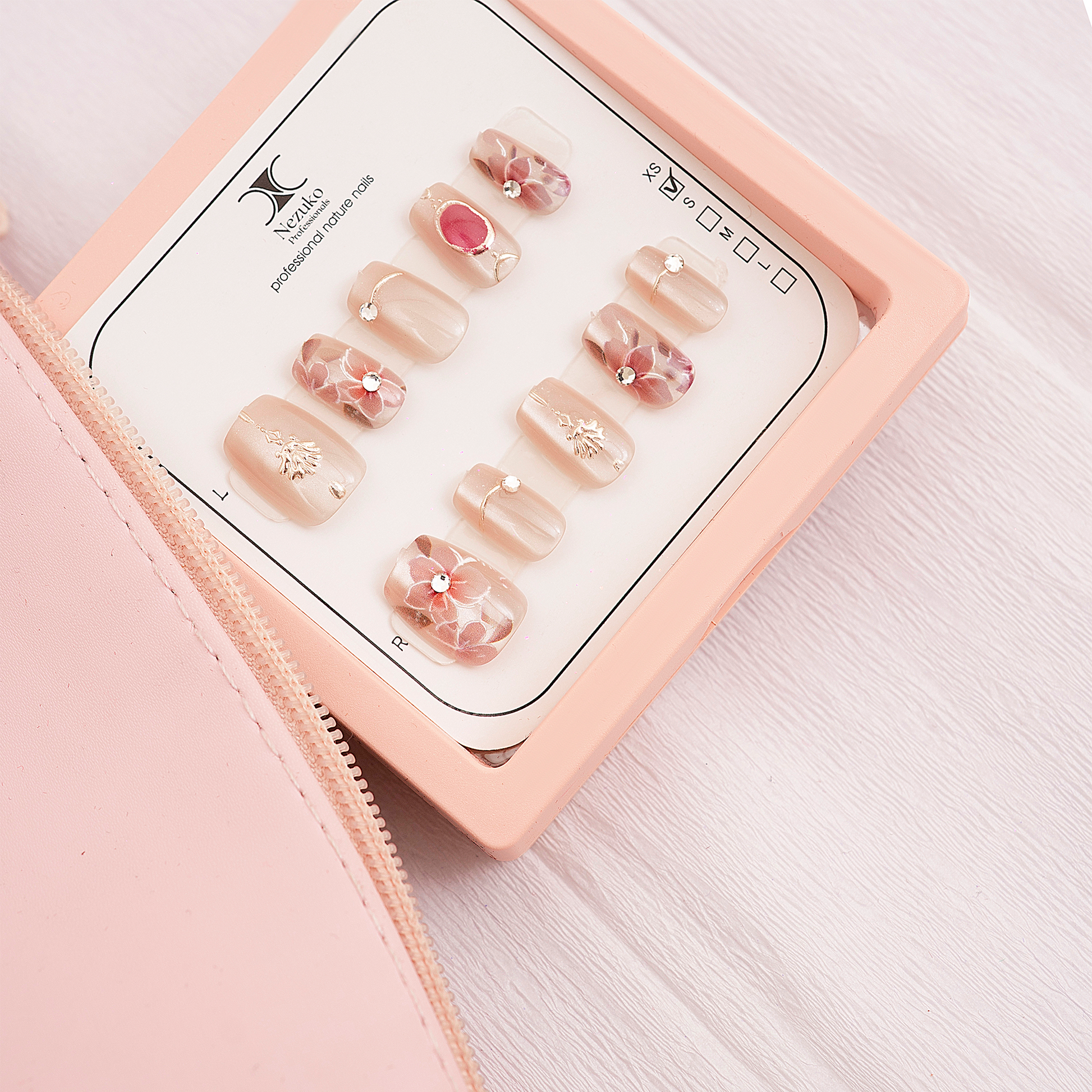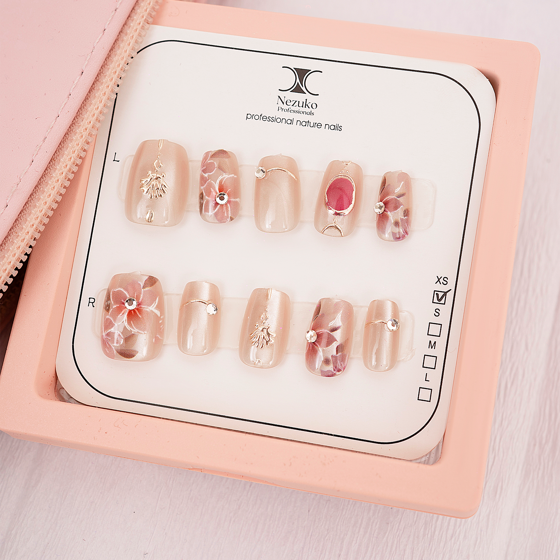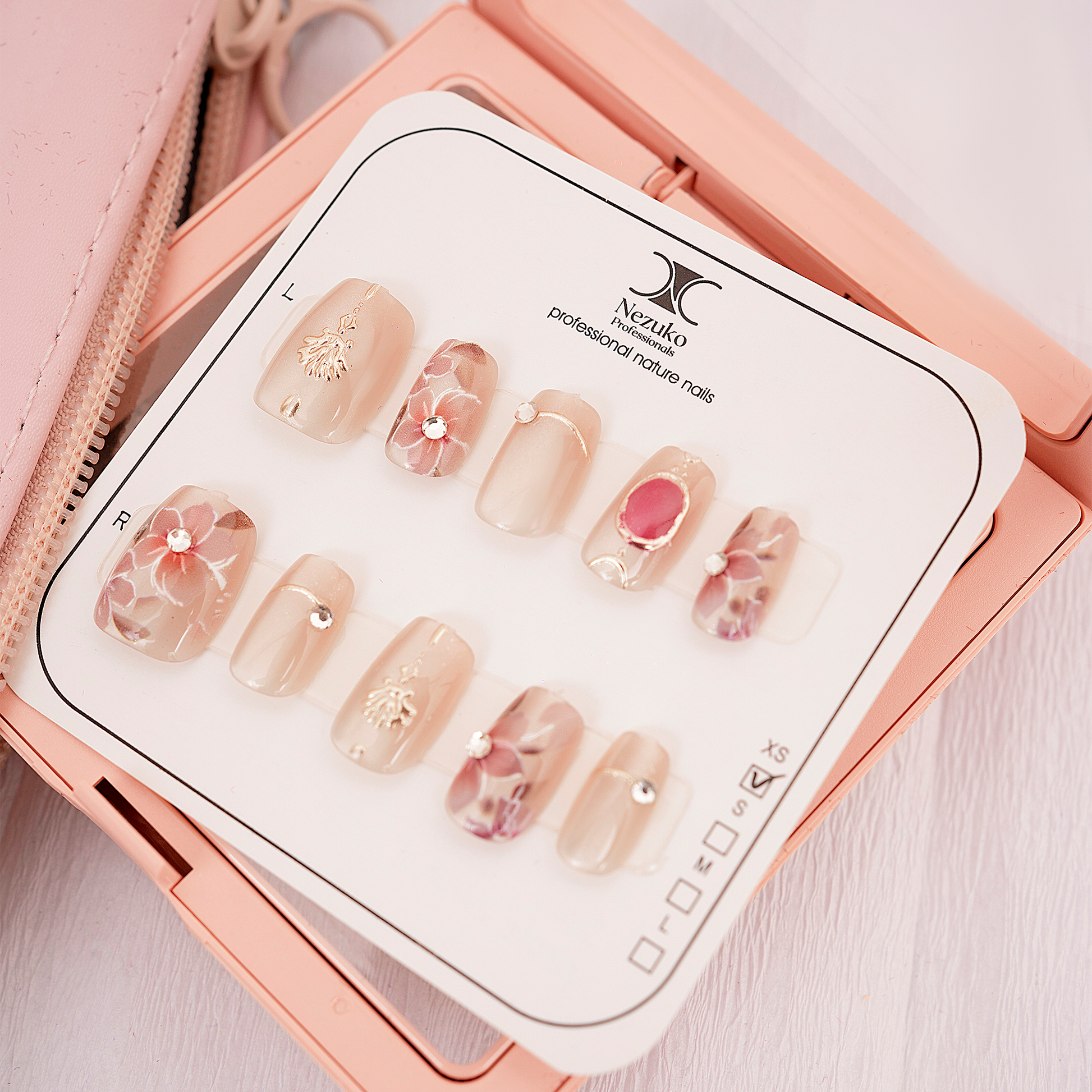 "A soft mocha-toned nail set decorated with delicate floral accents and a bold pop of deep red.The mix of subtle elegance and striking detail makes it perfect for both everyday wear and special occasions. Graceful, modern, and beautifully refined.