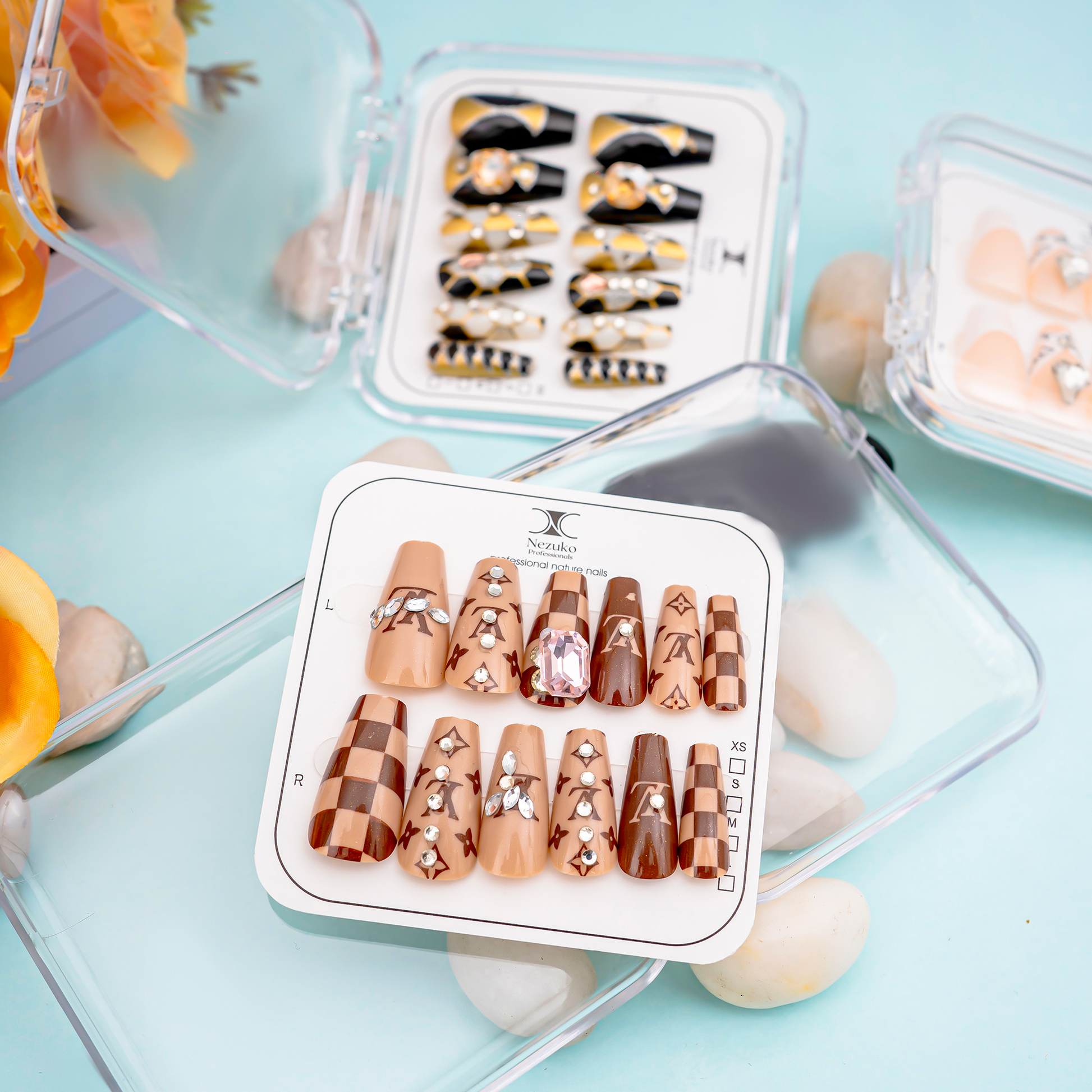 Warm mocha and nude tones blend with classy checker patterns, subtle bow accents, and crystal details.A chic, luxury-inspired nail set that feels cozy, elegant, and effortlessly stylish.