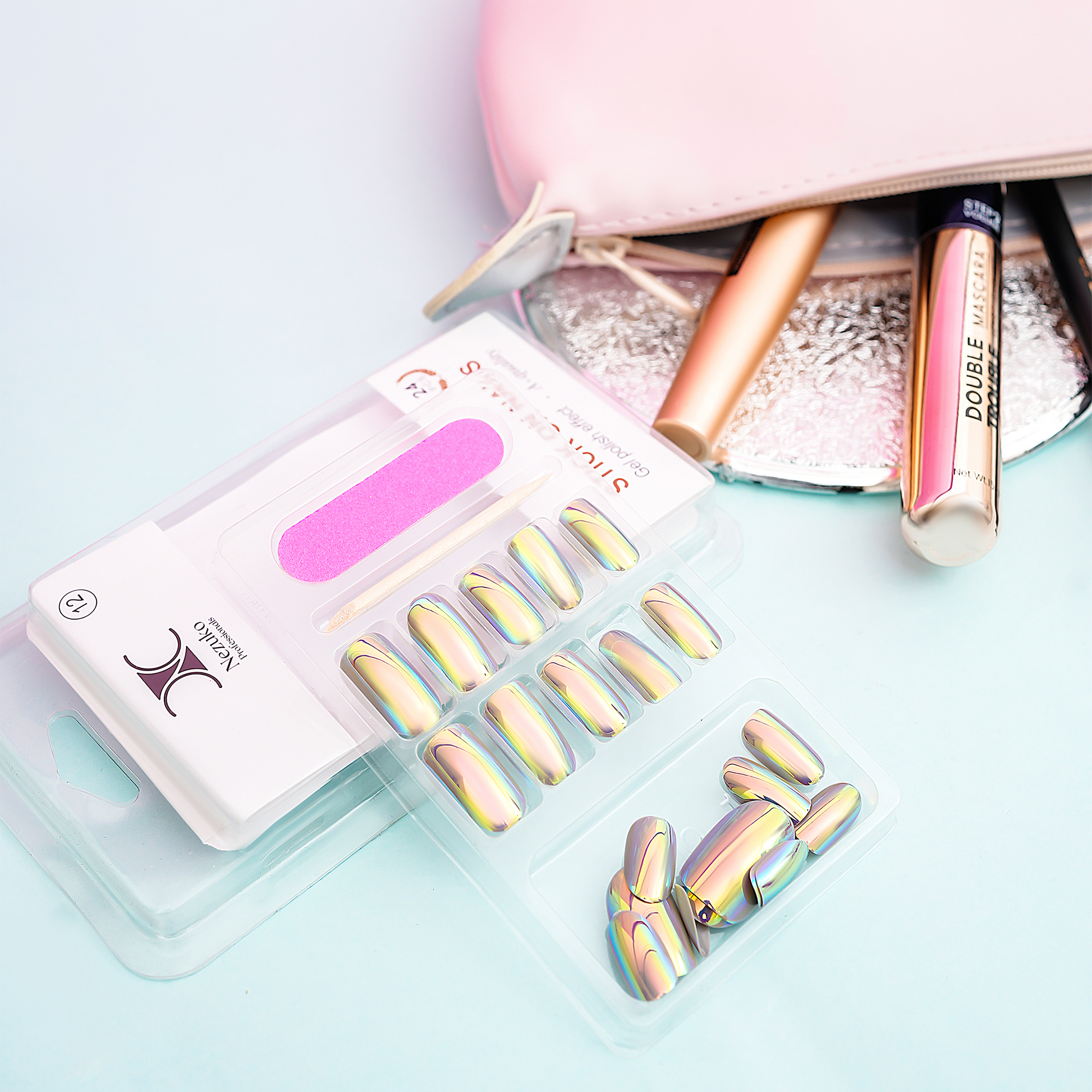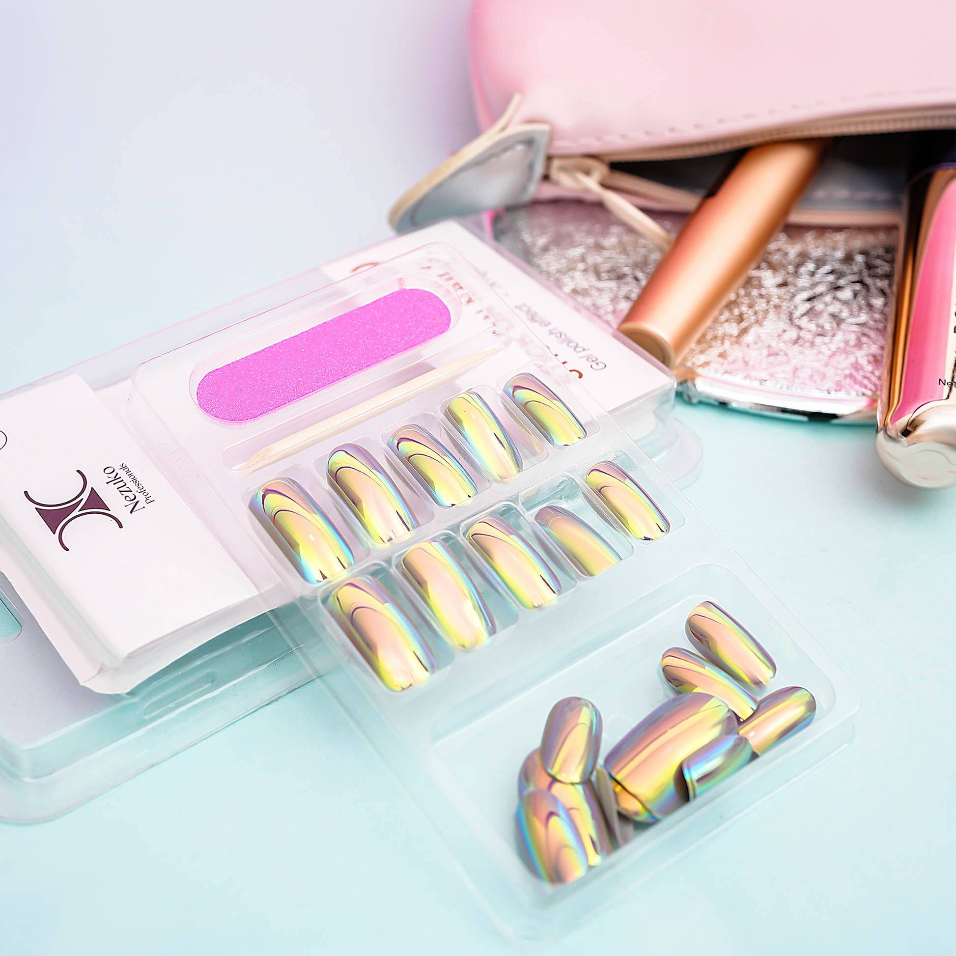 Short press-on nails with a smooth opal-chrome finish that shifts under light into reflective tones of pastel pink, lavender, mint, blue, and soft gold. The glossy gel-like surface creates a clean and luminous multi-sheen effect, offering a modern, lightweight, and eye-catching nail look.