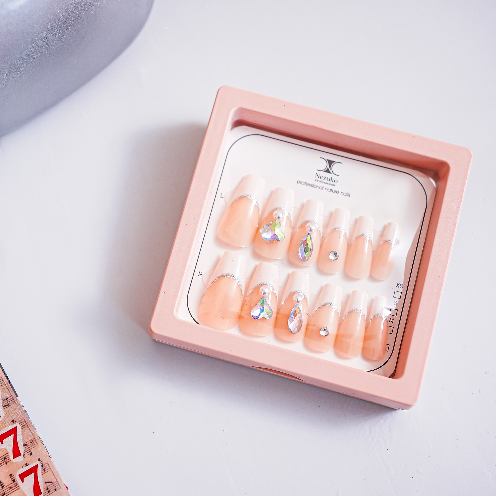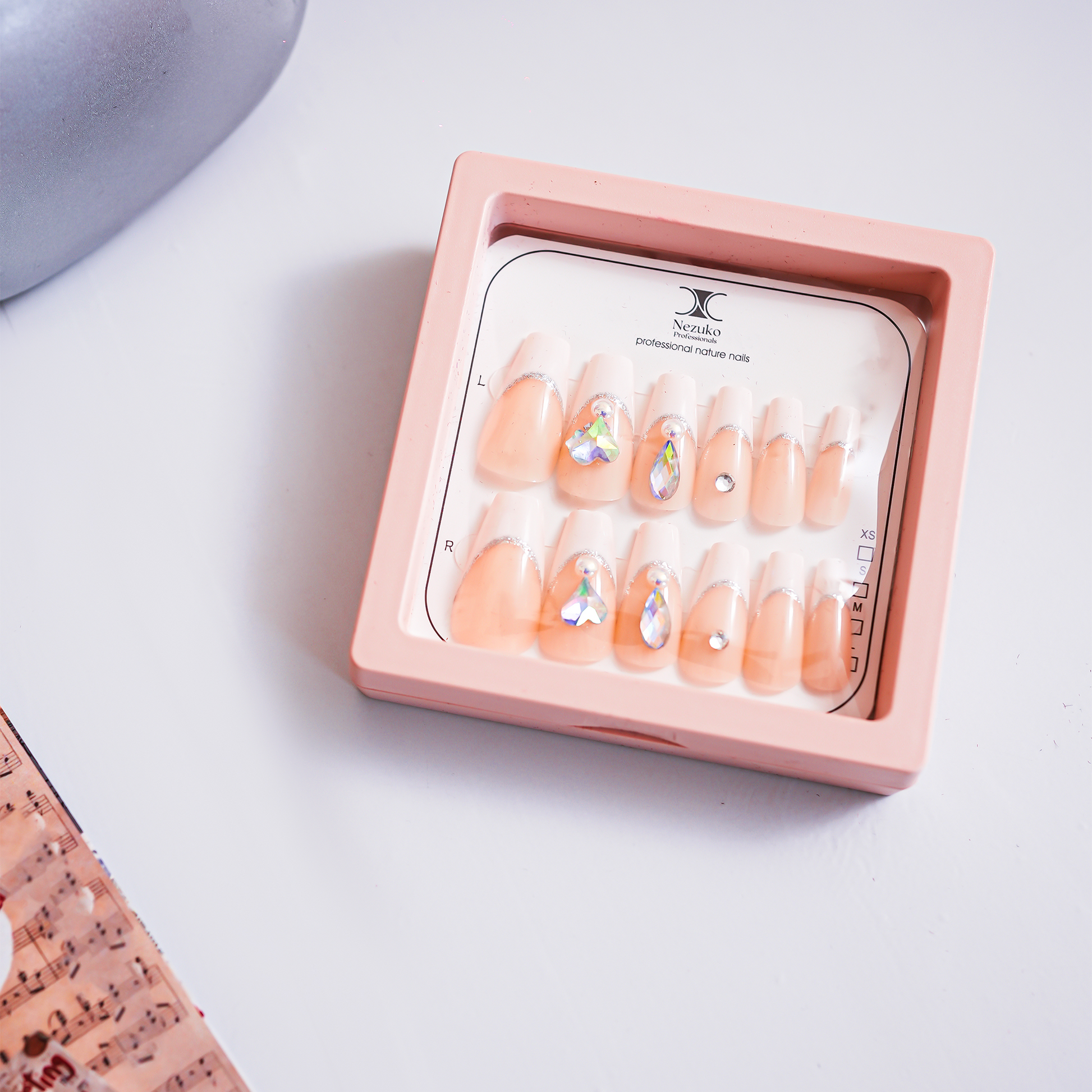 A soft nude base paired with clean white tips creates a timeless and classy look.The added crystals bring a sparkling, modern touch without overpowering the simplicity.Perfect for everyday wear, office looks, or adding subtle glamour to special events.
