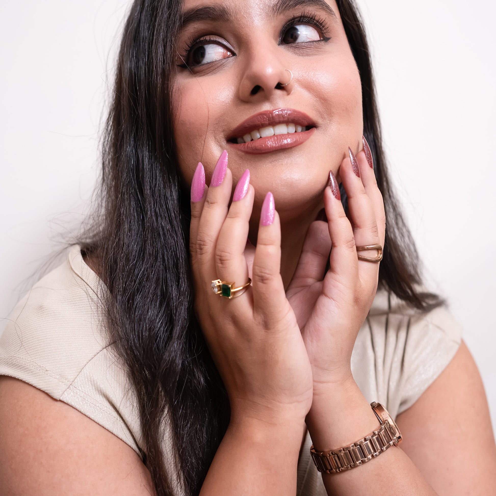 These vibrant pink glitter nails bring a sweet, playful pop of shine. The shimmering finish adds a candy-like glow, perfect for a fun, feminine, and eye-catching look.