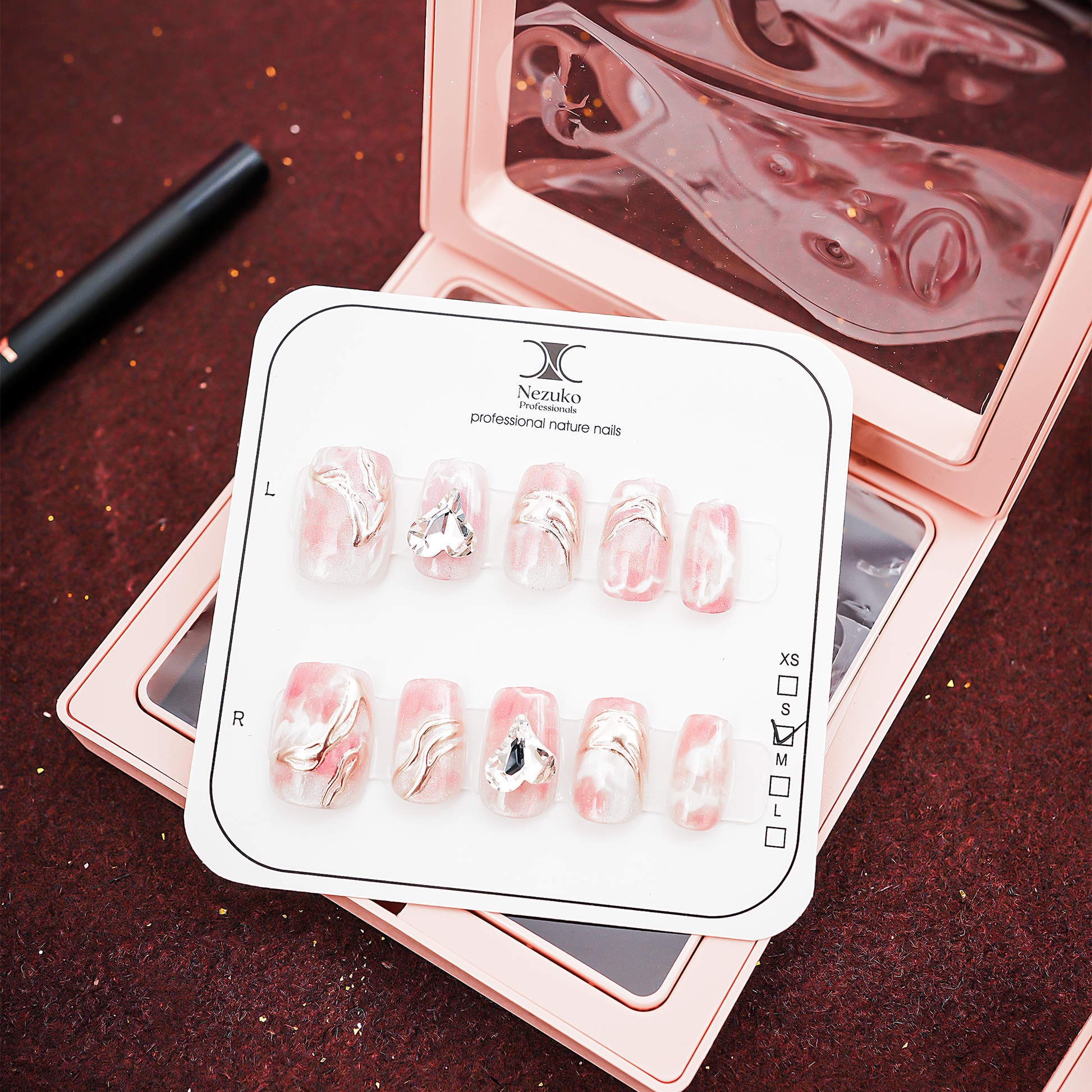 A rich rose-toned nail set with elegant marble patterns and subtle metallic accents.These nails bring a perfect mix of glam and sophistication, ideal for both parties and daily wear.Chic, bold, and effortlessly stylish.