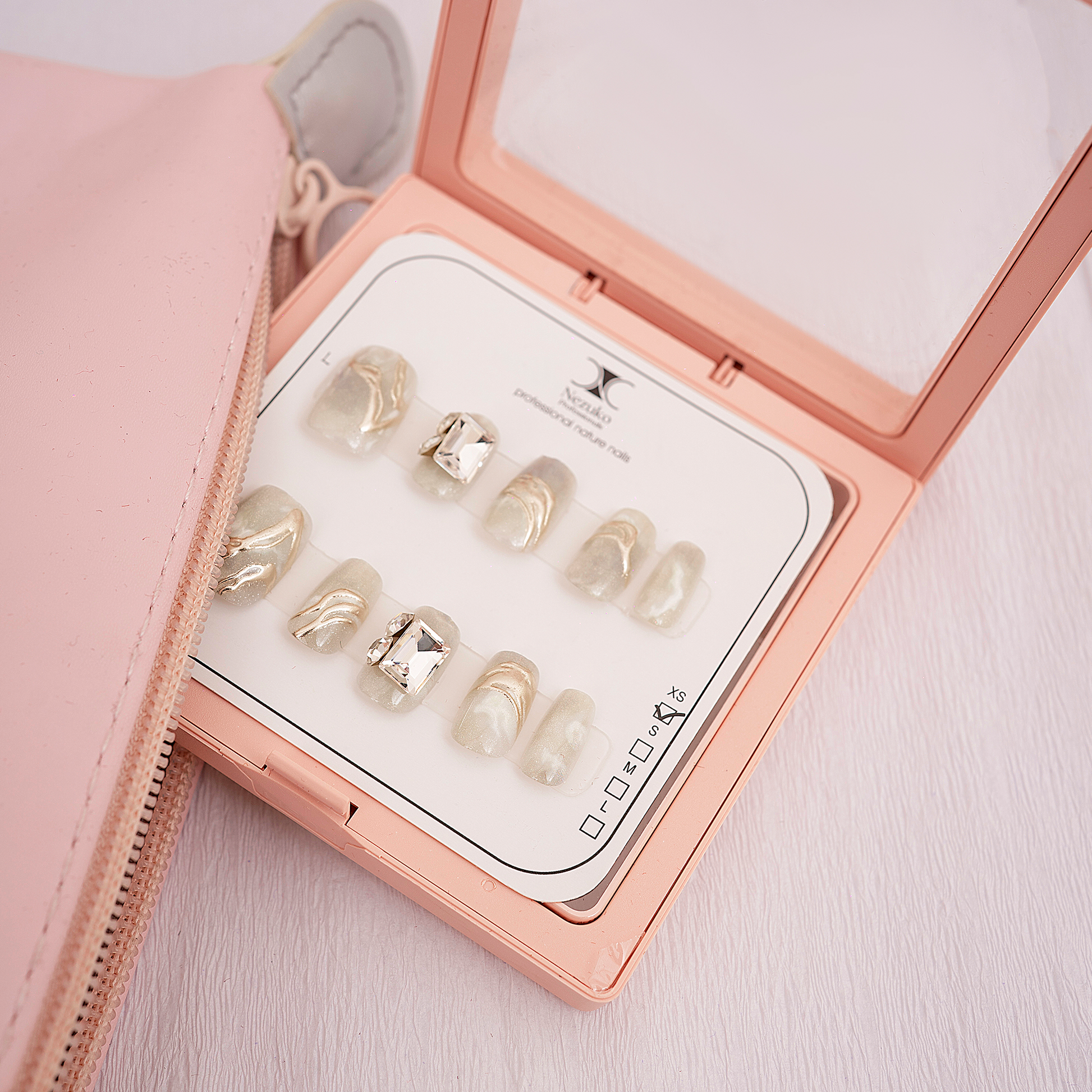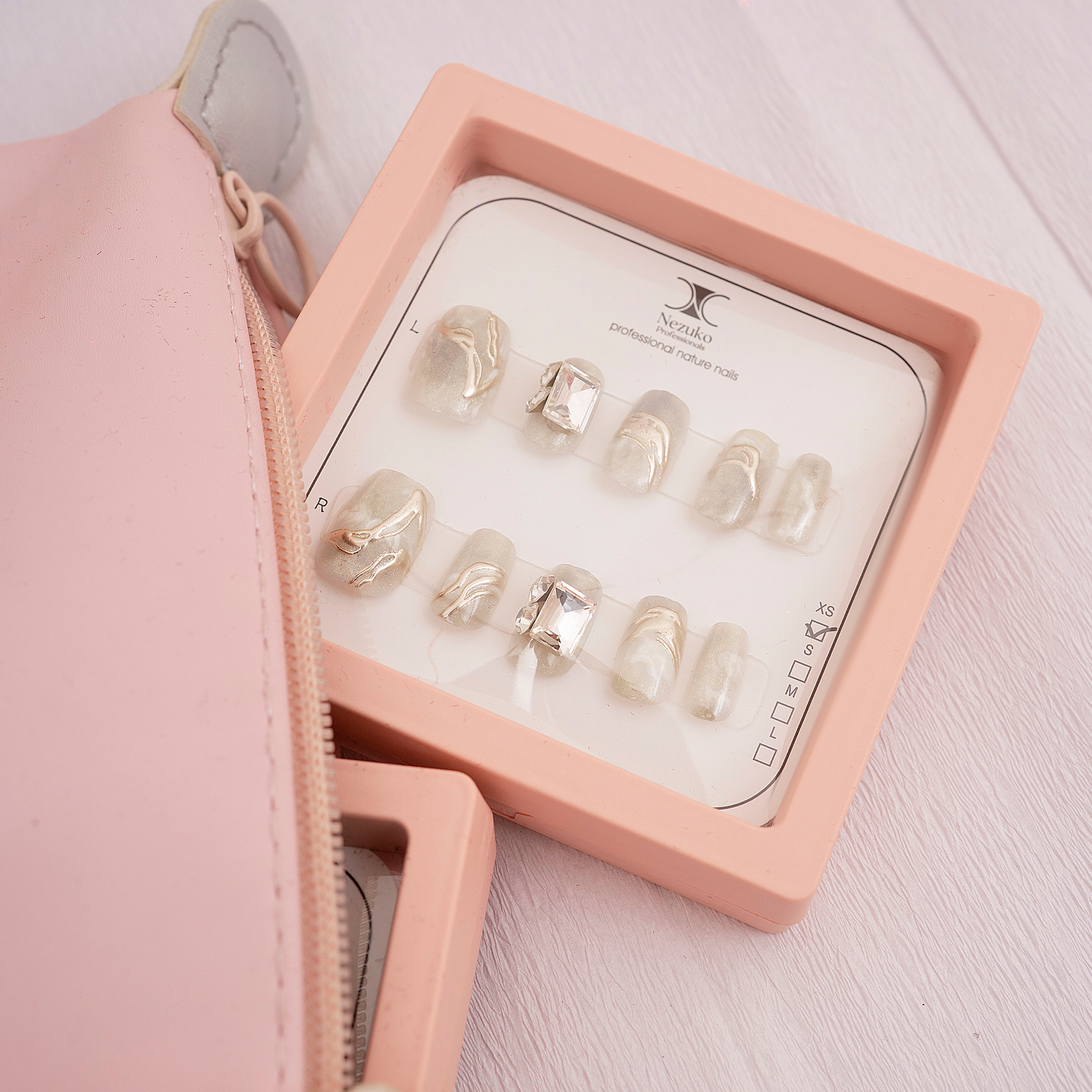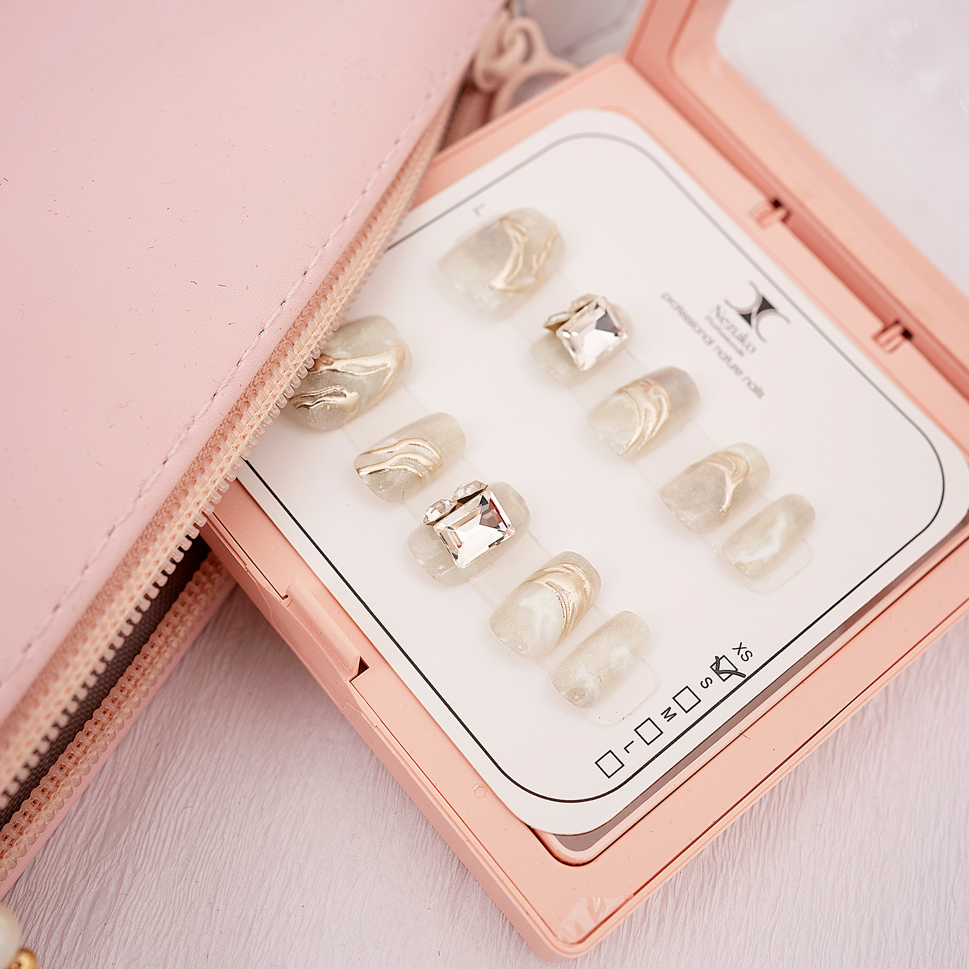 - Pick a press-on nail that fits your natural nail and apply it by pushing the base slightly under your cuticles, folding down and pressing on the nail for about 10-20 seconds.